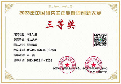 近日,中国研究生企业管理创新大赛总决赛在上海大学圆满落幕。该项赛事旨在激发研究生企业管理创新思维,培养未来商业领袖。比赛吸引了全国256所院校的2122支队伍参赛,经过初赛、复赛、决赛的多轮选拔和激烈角逐,共有来自120所院校的120支队伍晋级全国决赛,其中MBA组60支队伍,其他研究生组60支队伍。金沙990活动大厅2023级MBA代表队“前途无限”队(林佳捷,陈梓晨,苏伊涵)荣获三等奖。