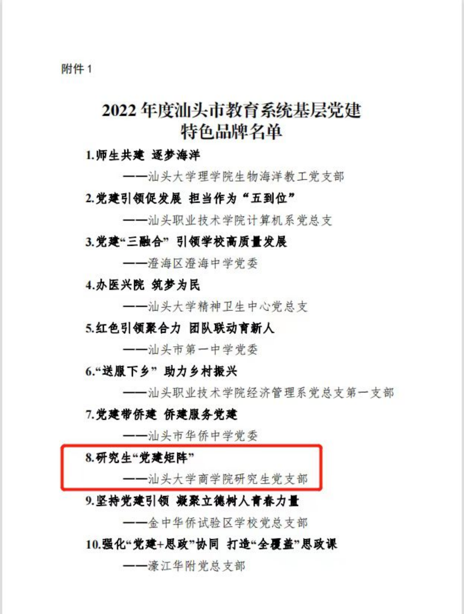 根据《关于开展汕头党建品牌创建提升行动的通知》文件精神,市委教育工委从全市基层党支部中评选出10个2022年度汕头市教育系统基层党建特色品牌,金沙990活动大厅研究生党支部党建品牌榜上有名,“研究生‘党建矩阵’”品牌获评“2022年度汕头市教育系统基层党建特色品牌”。