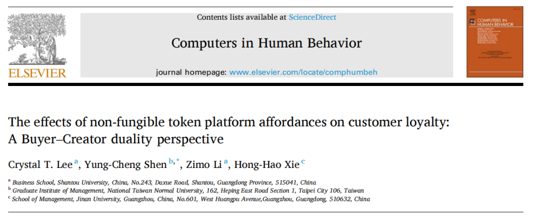 近日,金沙官网李姿莹副教授以第一作者的身份与中国台湾师范大学沈永正教授、金沙官网研究生李子墨、暨南大学硕士研究生谢宏浩(金沙990活动大厅2023届本科毕业生)合作完成的学术论文《The effects of non-fungible token platform affordances on customer loyalty: A Buyer–Creator duality perspective》被中科院大类一区Top期刊Computers in Human Behavior接受发表。